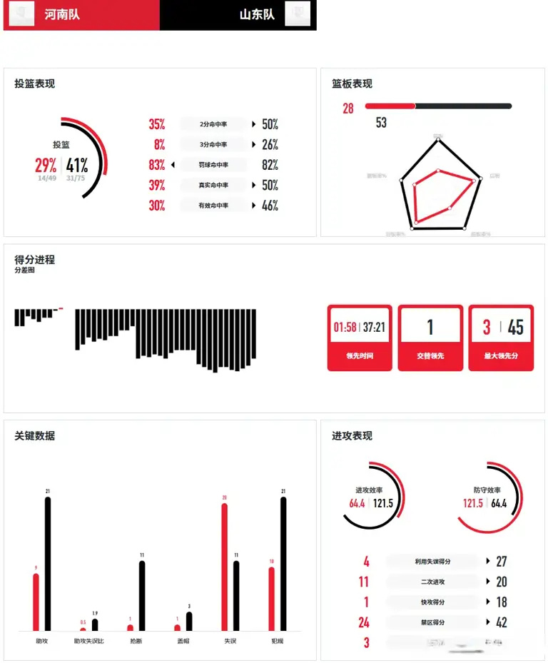比赛伊始,山东队就迅速进入状态,完全掌控了场上节奏。面对缺少核心球员的河南队,山东队在首节就建立起25比13的两位数领先优势。进入第二节,山东队继续扩大领先优势,单节打出28比11的攻势,半场结束时已将分差扩大到29分。山东队王英竹和安静分别贡献10分4篮板和12分,表现可圈可点。