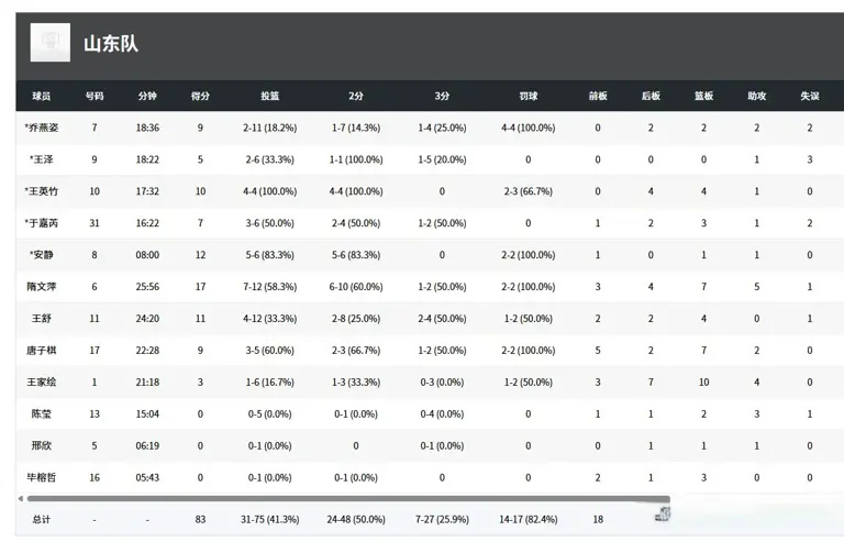 在球员个人表现方面,山东队展现出更强的整体实力,共有四名球员得分上双。其中隋文萍发挥全面,贡献17分7篮板5助攻;安静得到12分,王英竹和王舒分别拿下10分和11分。相比之下,河南队仅有成琦一人得分上双,他全场得到19分7篮板。