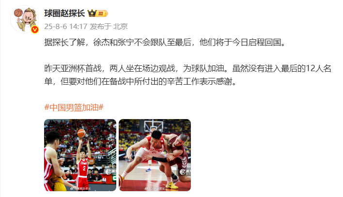 “据探长了解,徐杰和张宁不会跟队至最后,他们将于今日启程回国。”该媒体人在社媒上写道。